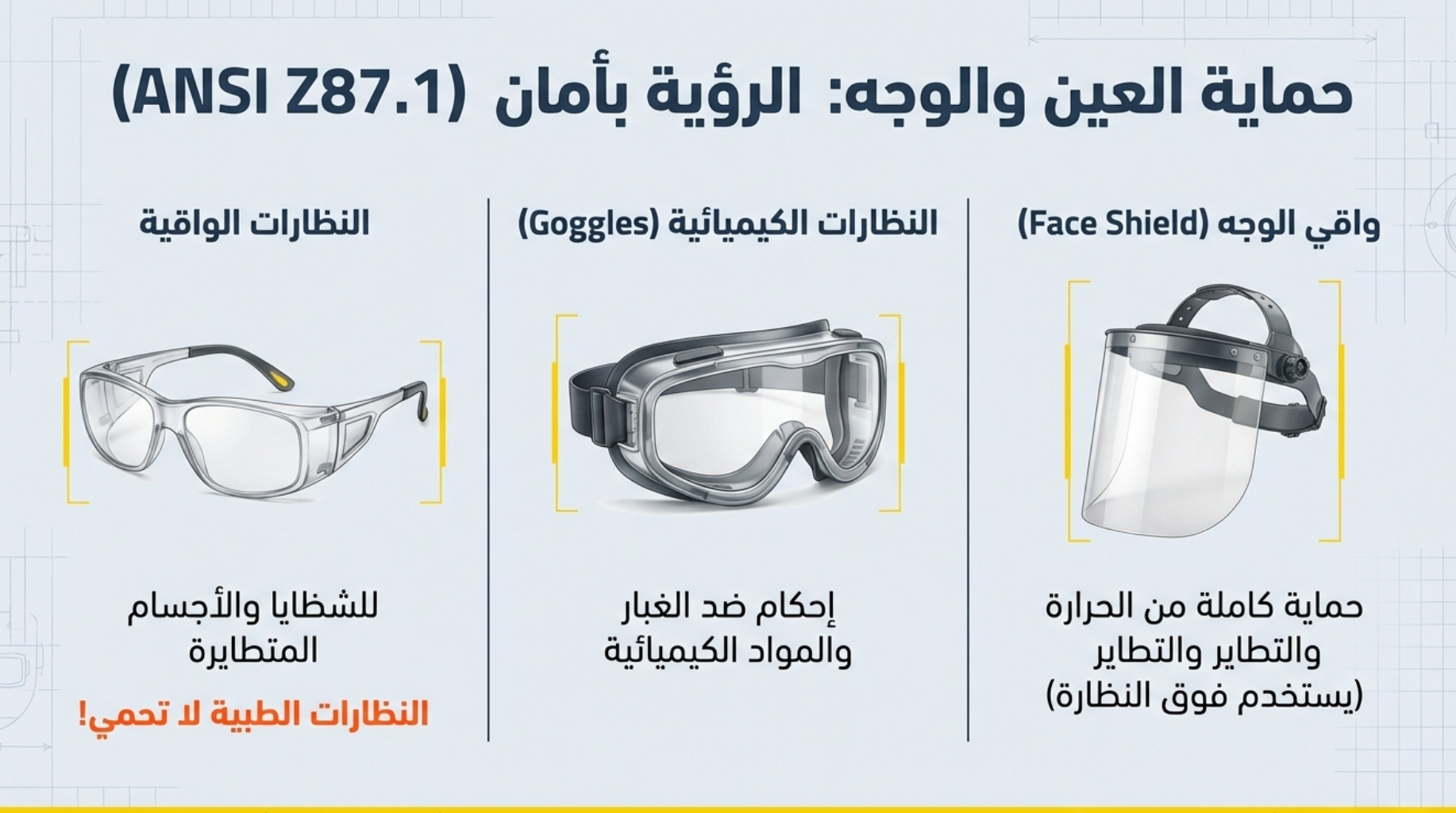 - حماية العين والوجه: النظارات الواقية، وحواجز الوجه (Face Shields) للحماية من الشظايا، المتطاير، أو المواد الكيميائية.