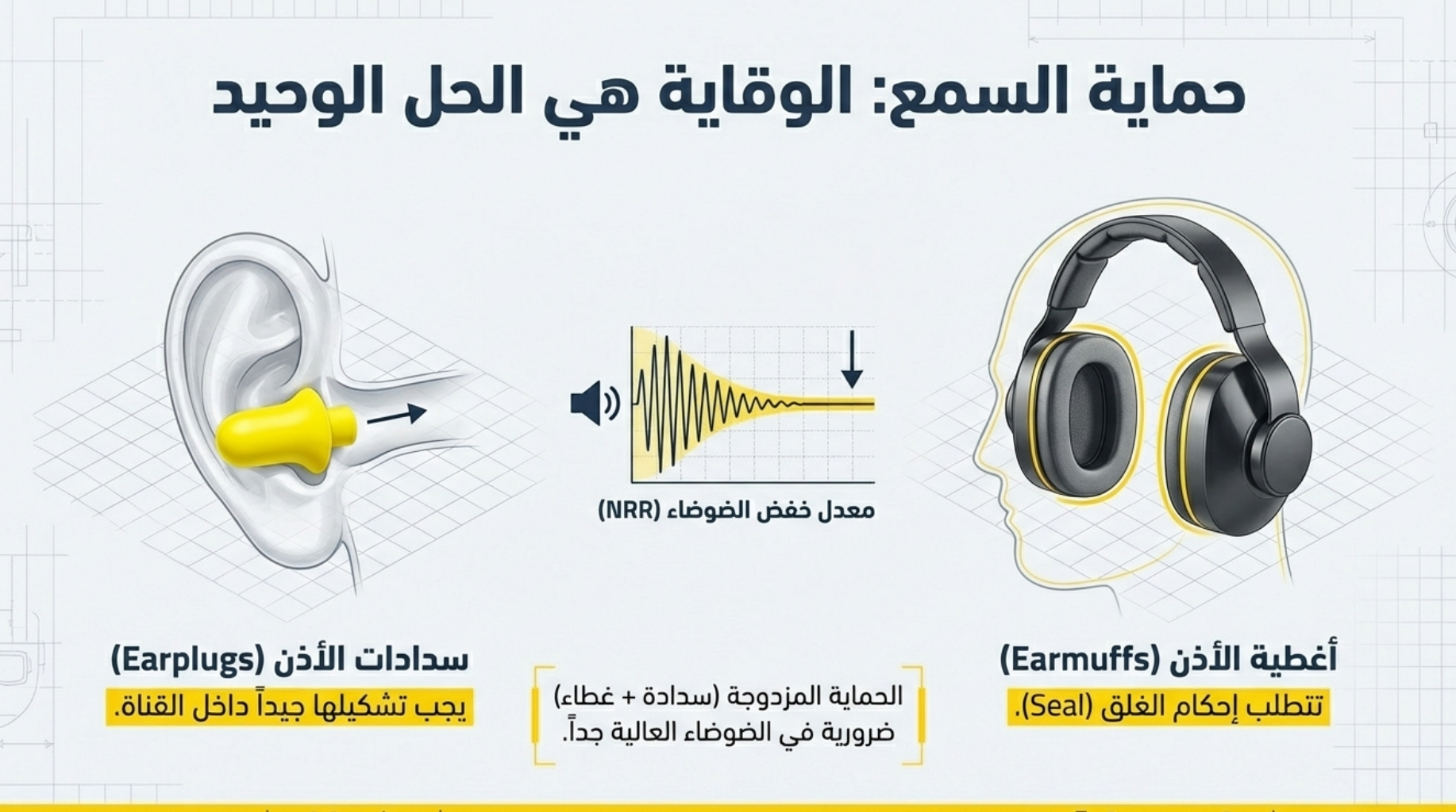 - حماية السمع: سدادات الأذن (Earplugs) أو أغطية الأذن (Earmuffs) للحد من تأثير الضوضاء العالية.