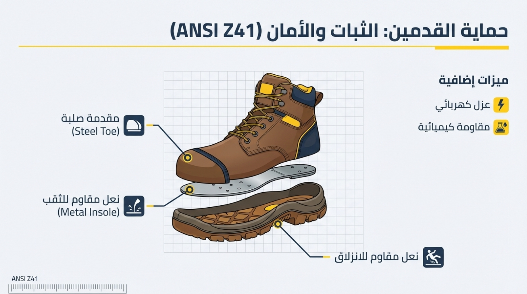 - حماية القدمين: أحذية السلامة (Safety Shoes) المزودة بمقدمة فولاذية ونعل مقاوم للانزلاق أو الثقب.