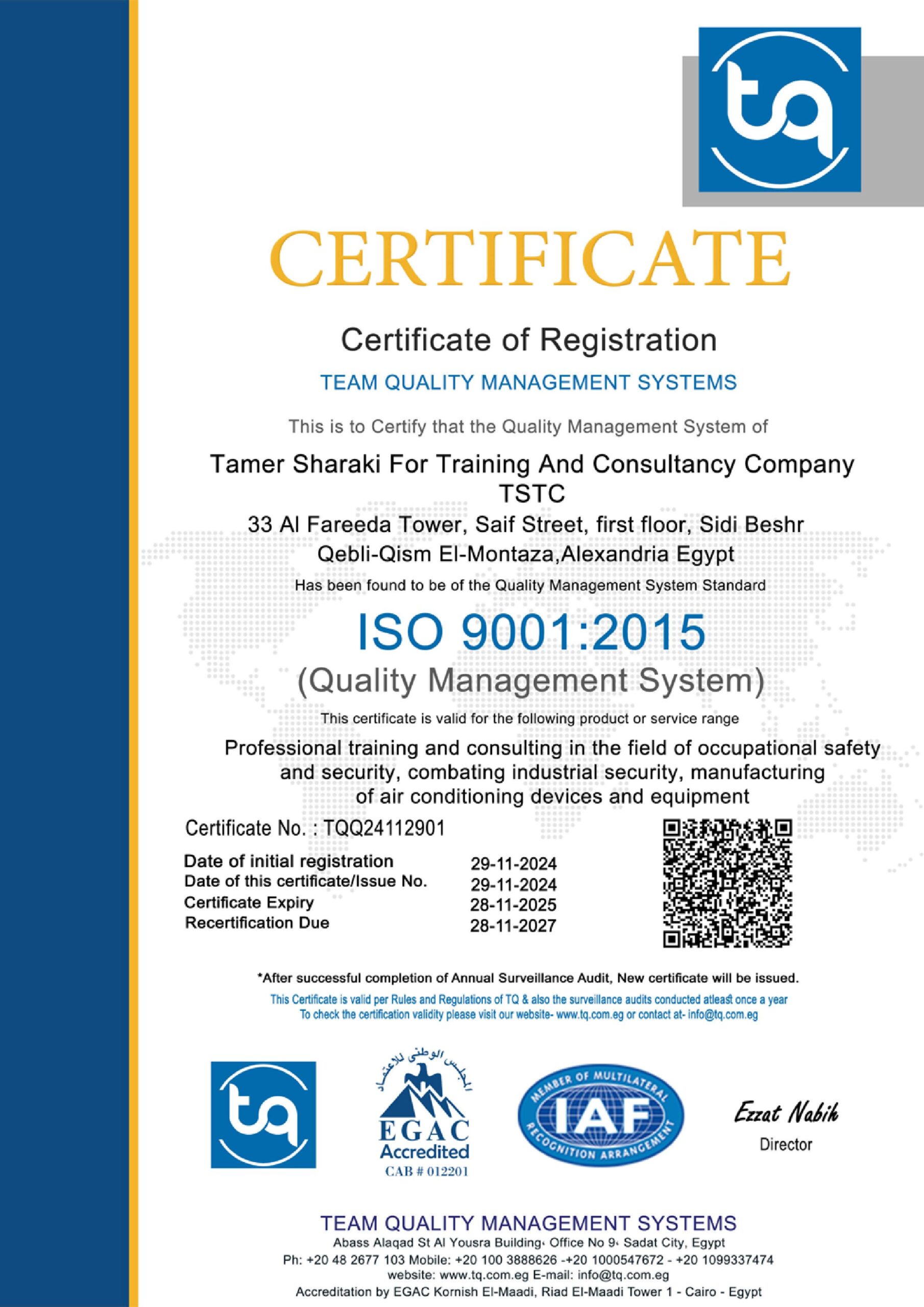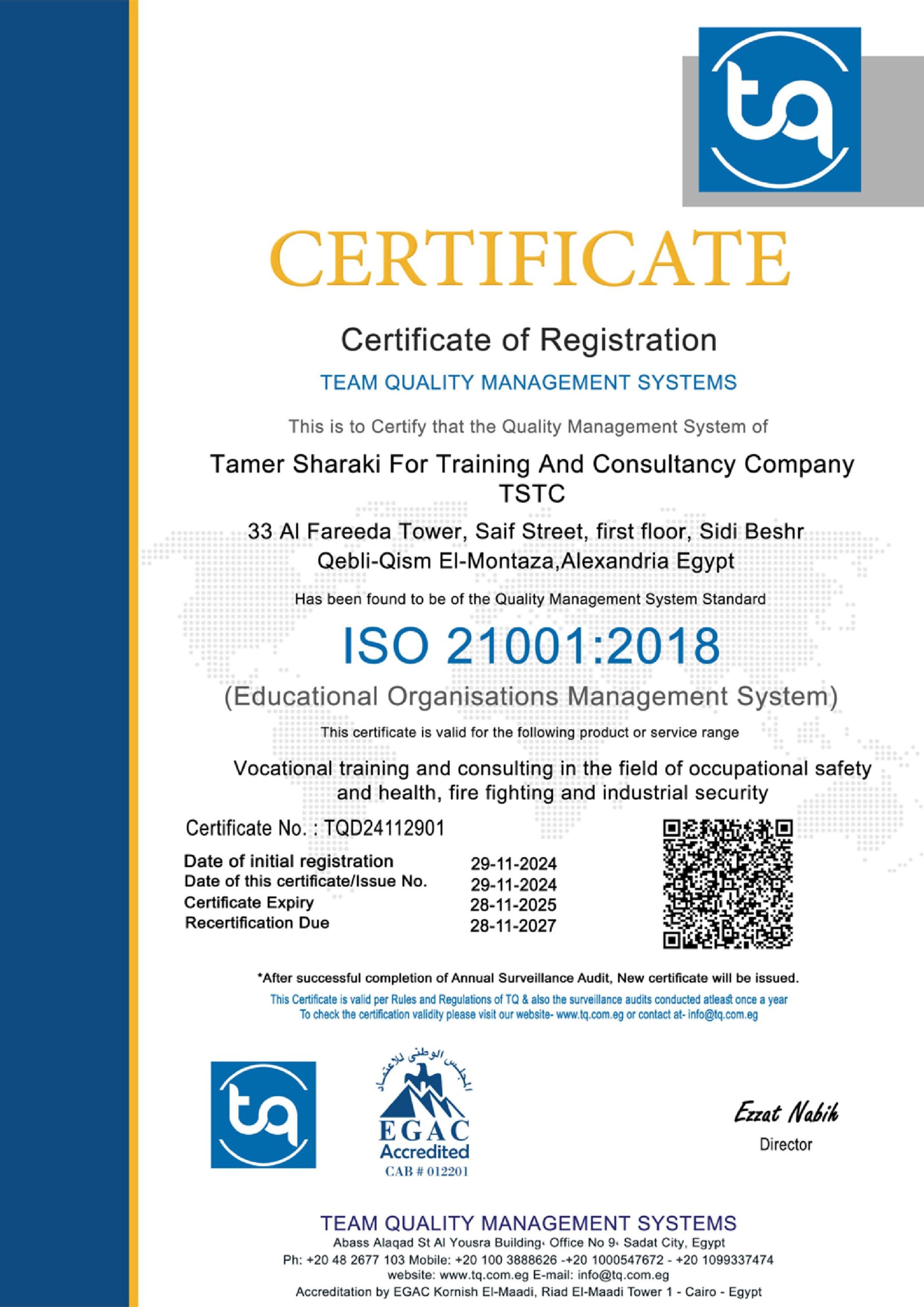 حصول شركة تامر شراكي للتدريب والاستشارات TSTC على شهادة الايزو 21001 في نظم إدارة المنظمات التعليمية