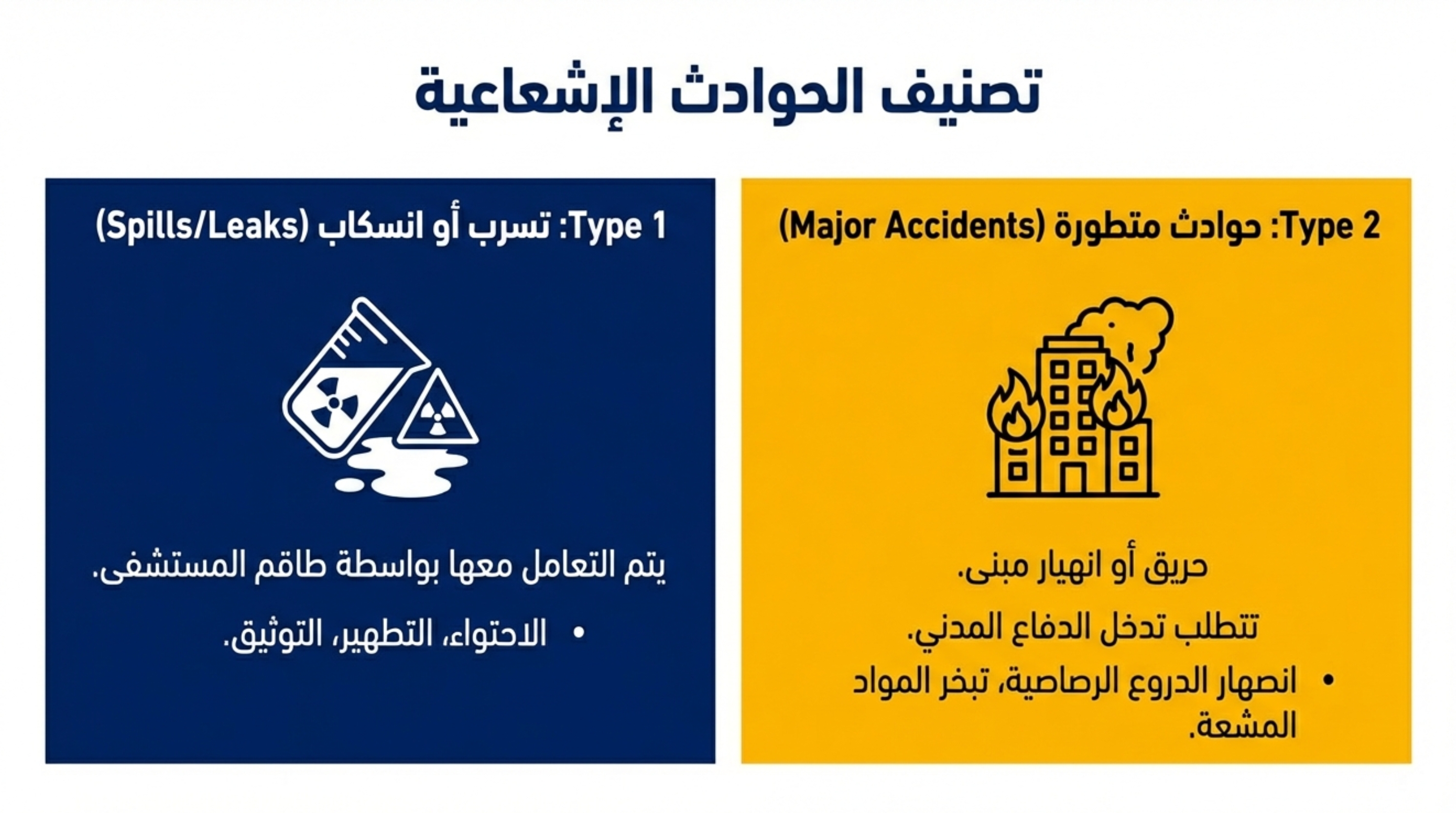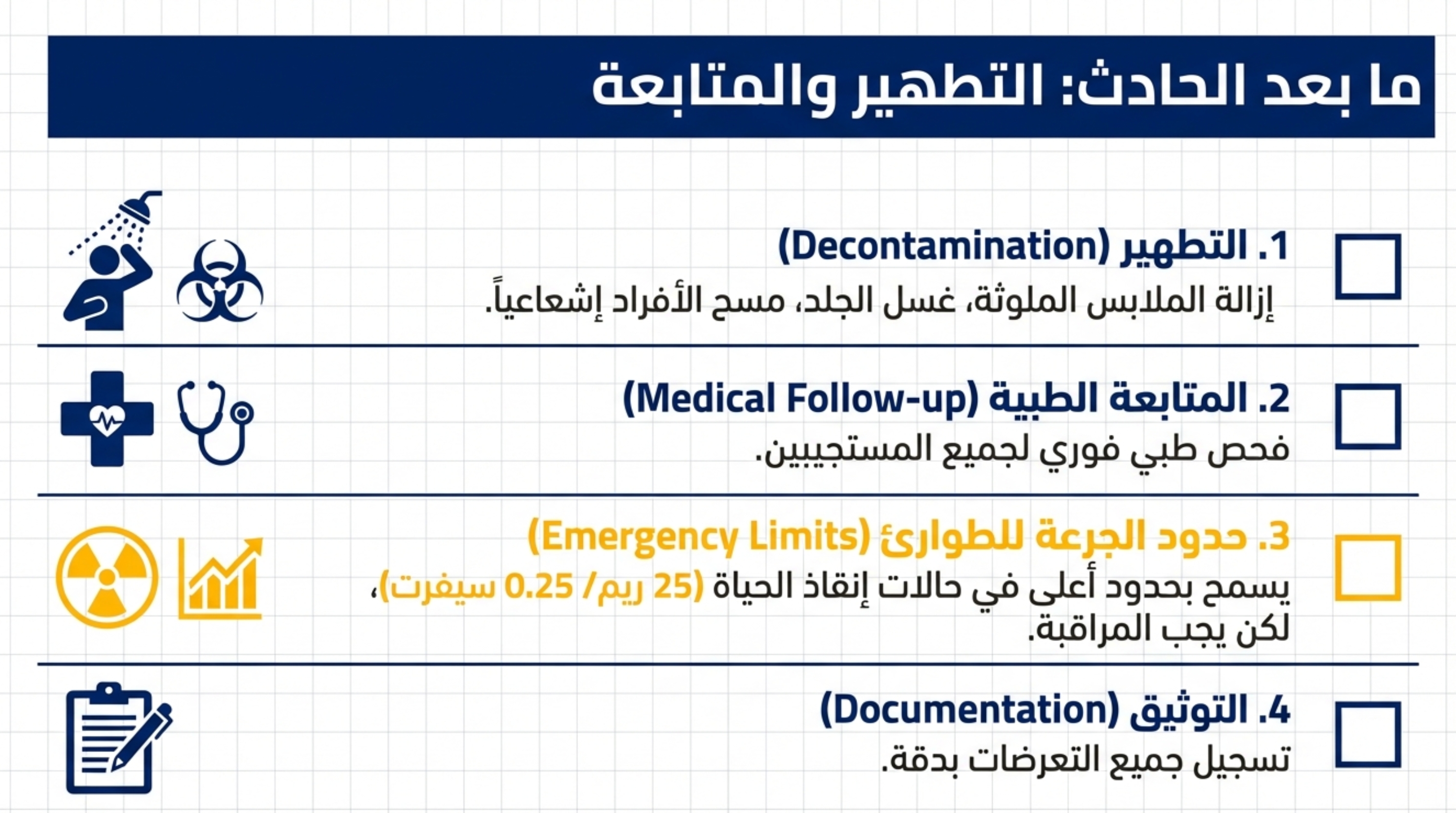 - التطهير: بعد السيطرة على الحادث، يجب إجراء مسح إشعاعي للأفراد والمكان، وتطهير أي تلوث، مع إجراء فحص طبي عاجل للمتعرضين.