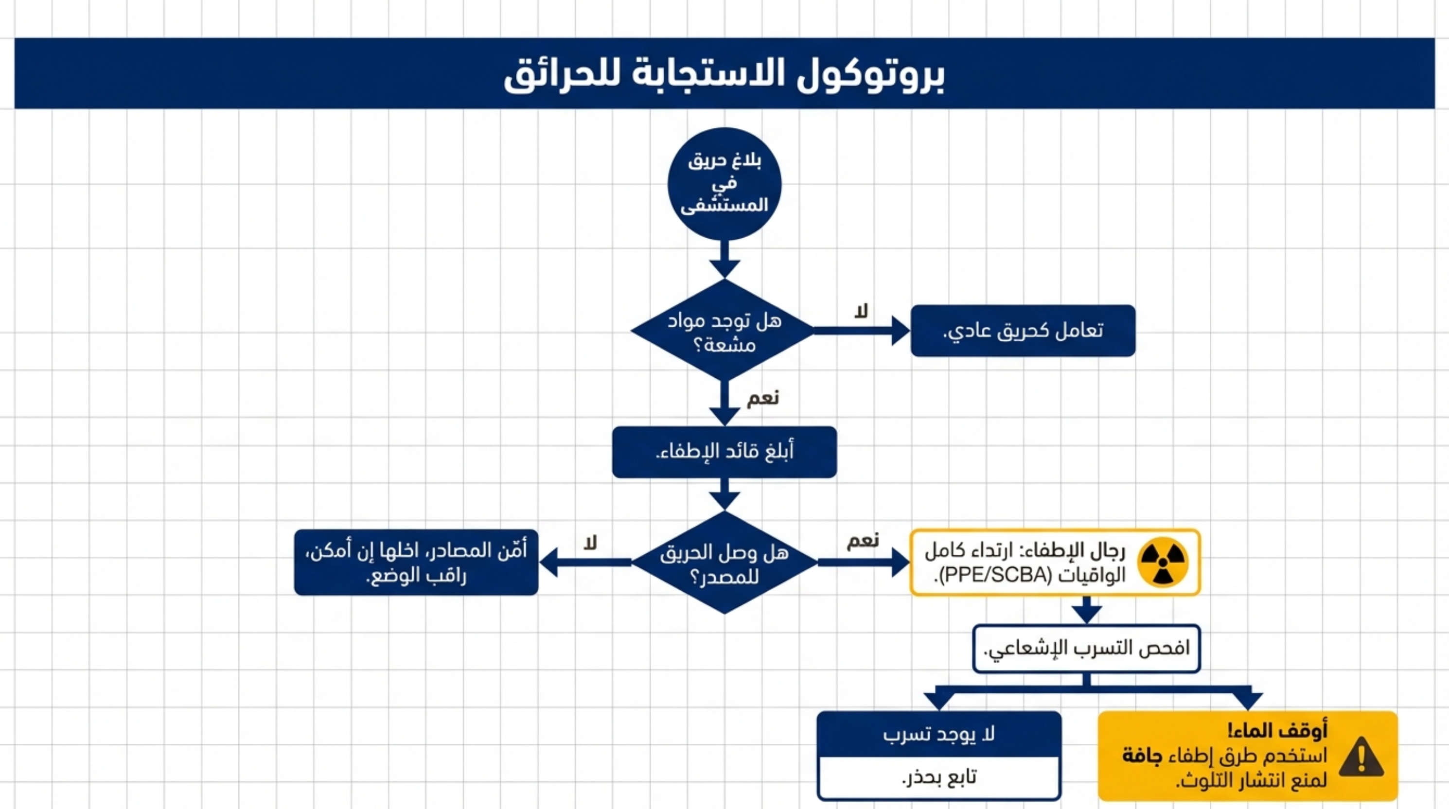عند حدوث طوارئ إشعاعية، يتم اتباع الخطوات التالية: