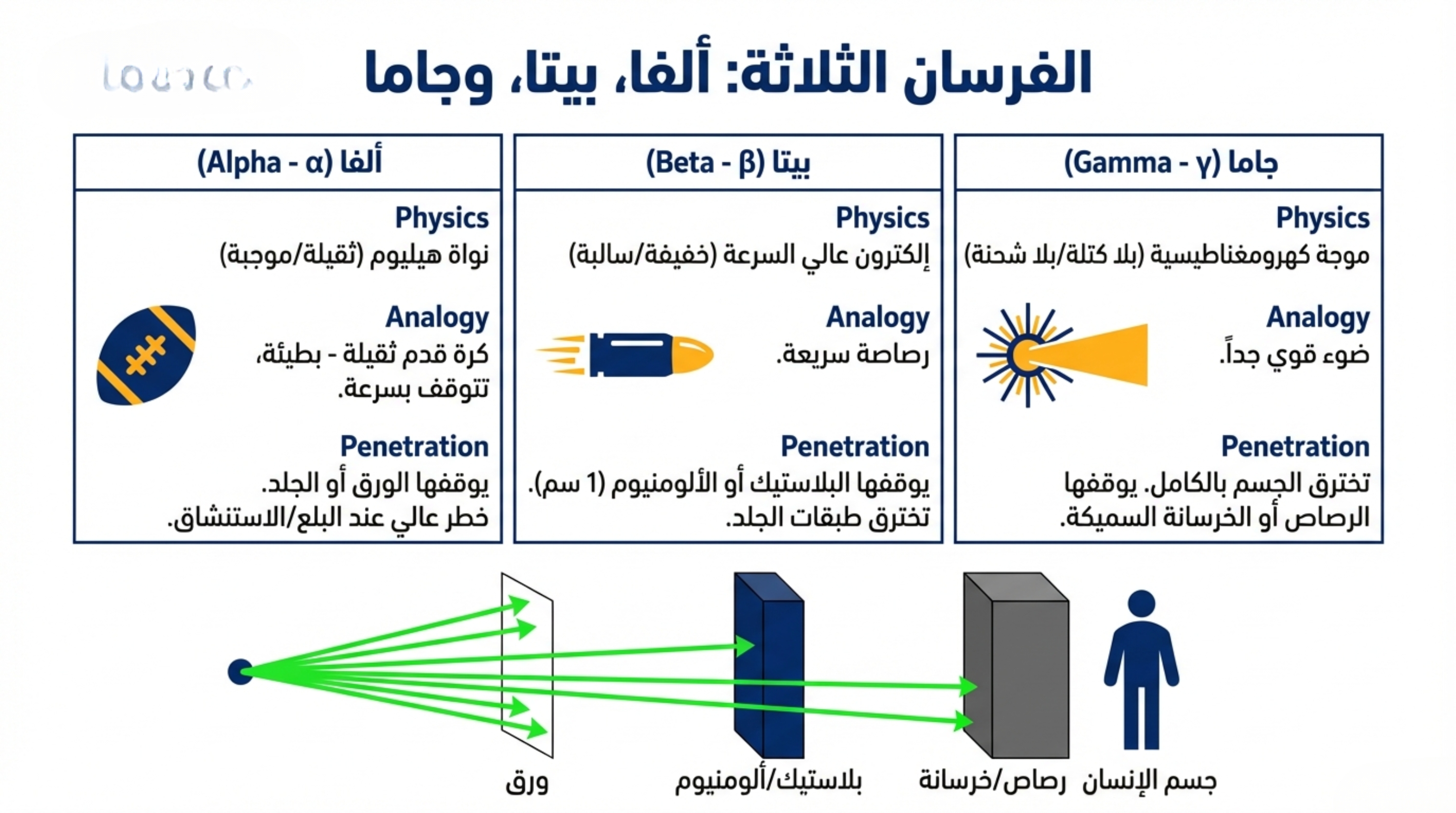 - الدروع: استخدام حواجز مادية لامتصاص الأشعة، مثل الرصاص لأشعة جاما والسينية، أو الخشب والألومنيوم لأشعة بيتا، والكونكريت للأشعة عالية الاختراق.