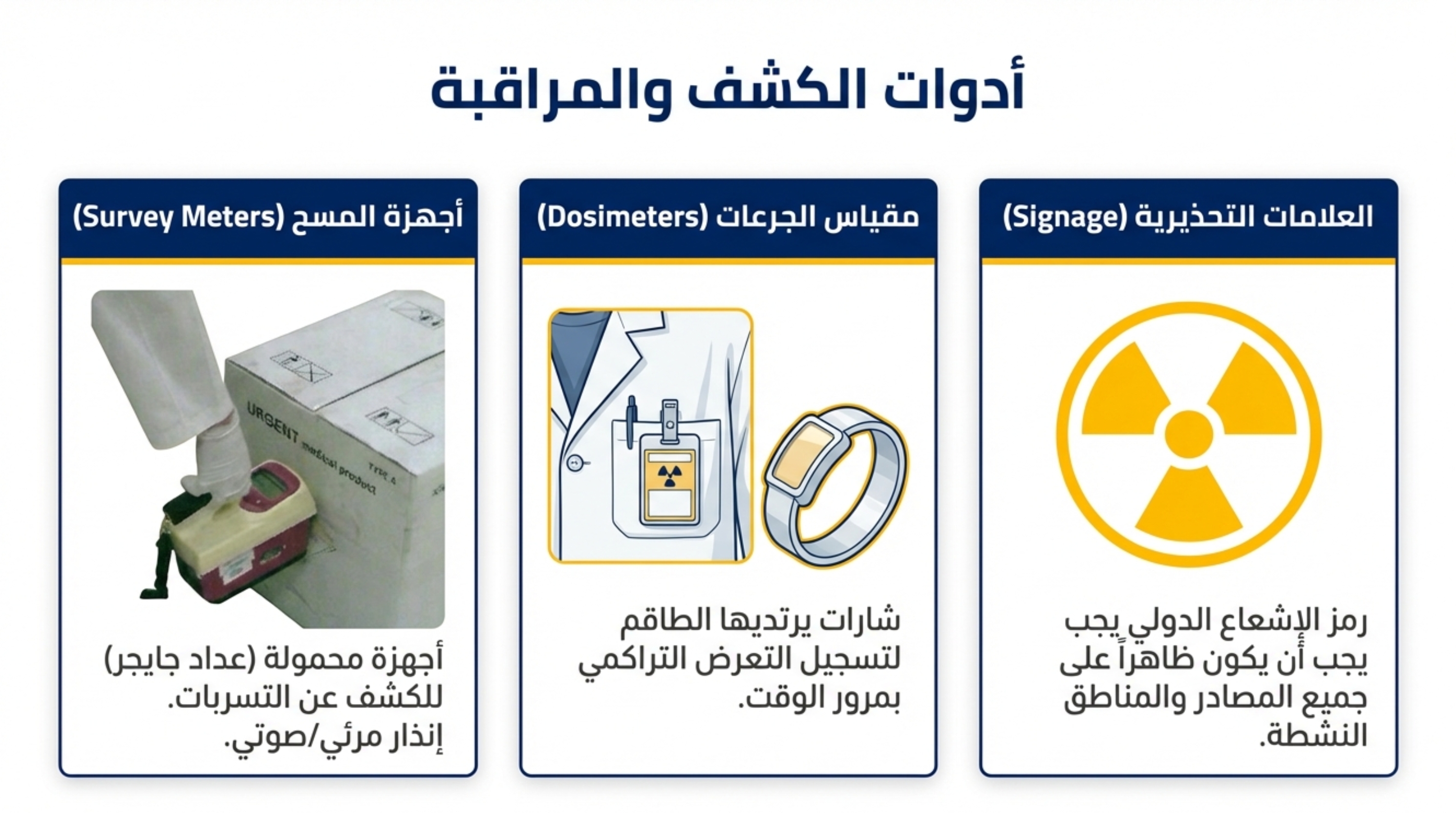 - العلامات التحذيرية: وضع شارات الإشعاع الدولية بشكل بارز على مناطق تواجد الأشعة وحاويات المواد المشعة.