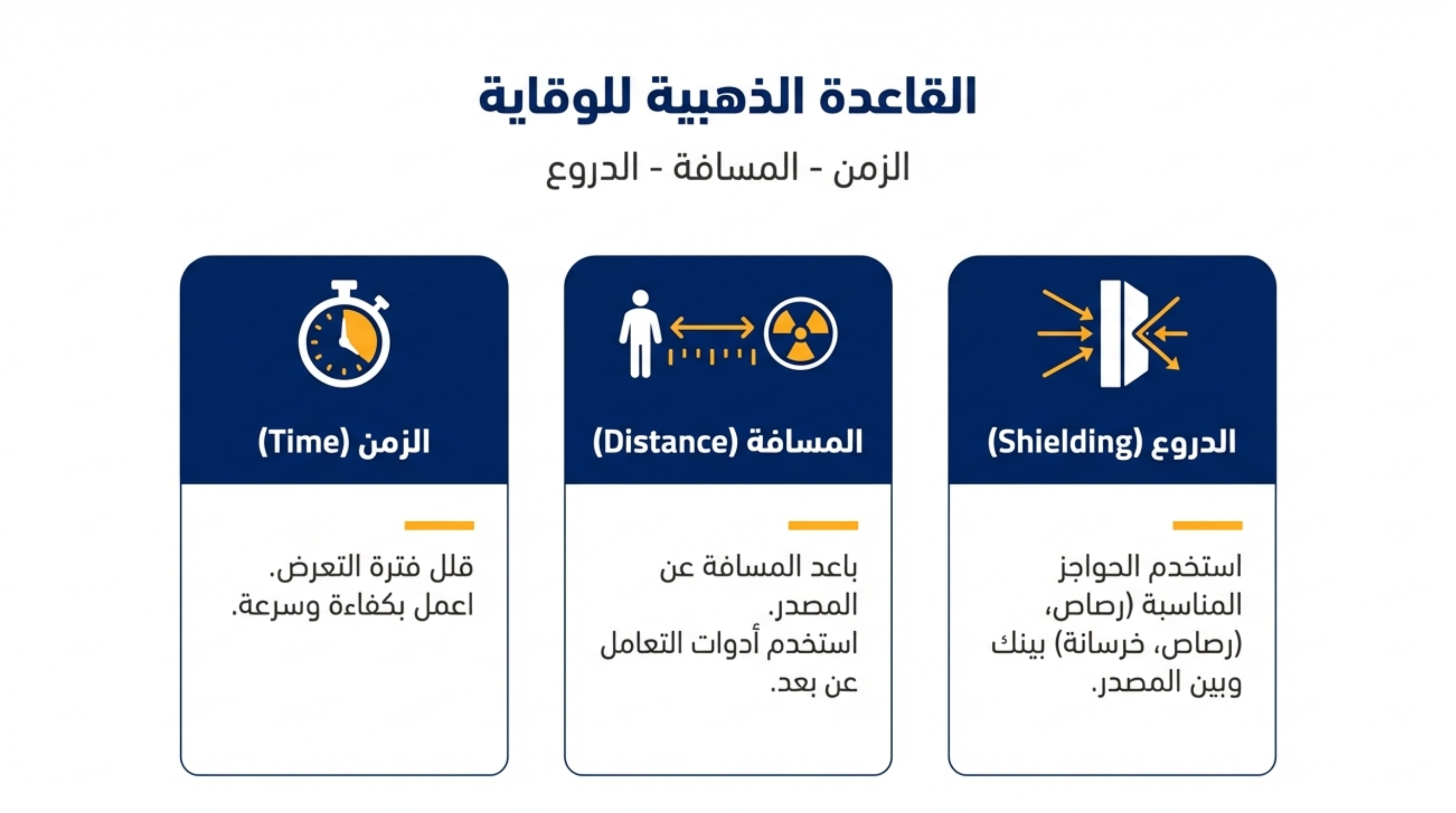 تعتمد الوقاية من الأخطار الإشعاعية على ثلاث قواعد ذهبية علمية: