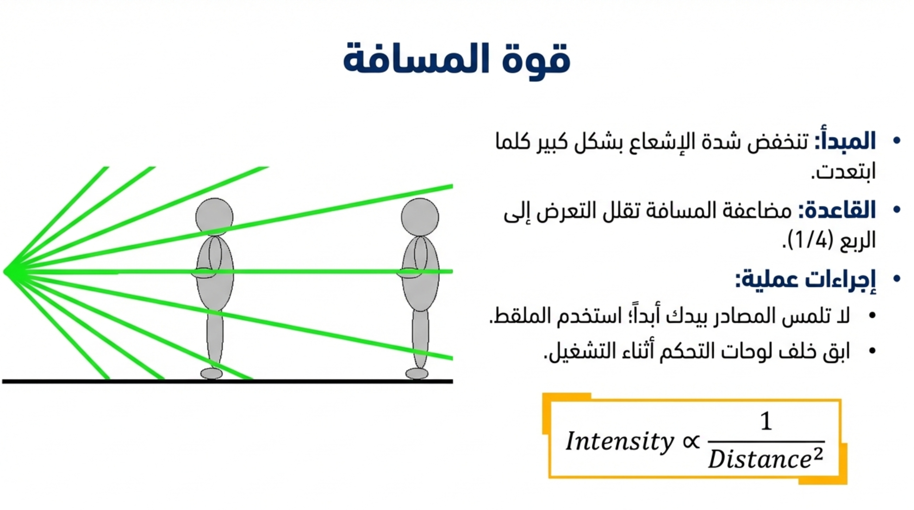 - المسافة: زيادة المسافة بين الشخص والمصدر تقلل الجرعة الإشعاعية بشكل كبير (قانون التربيع العكسي).