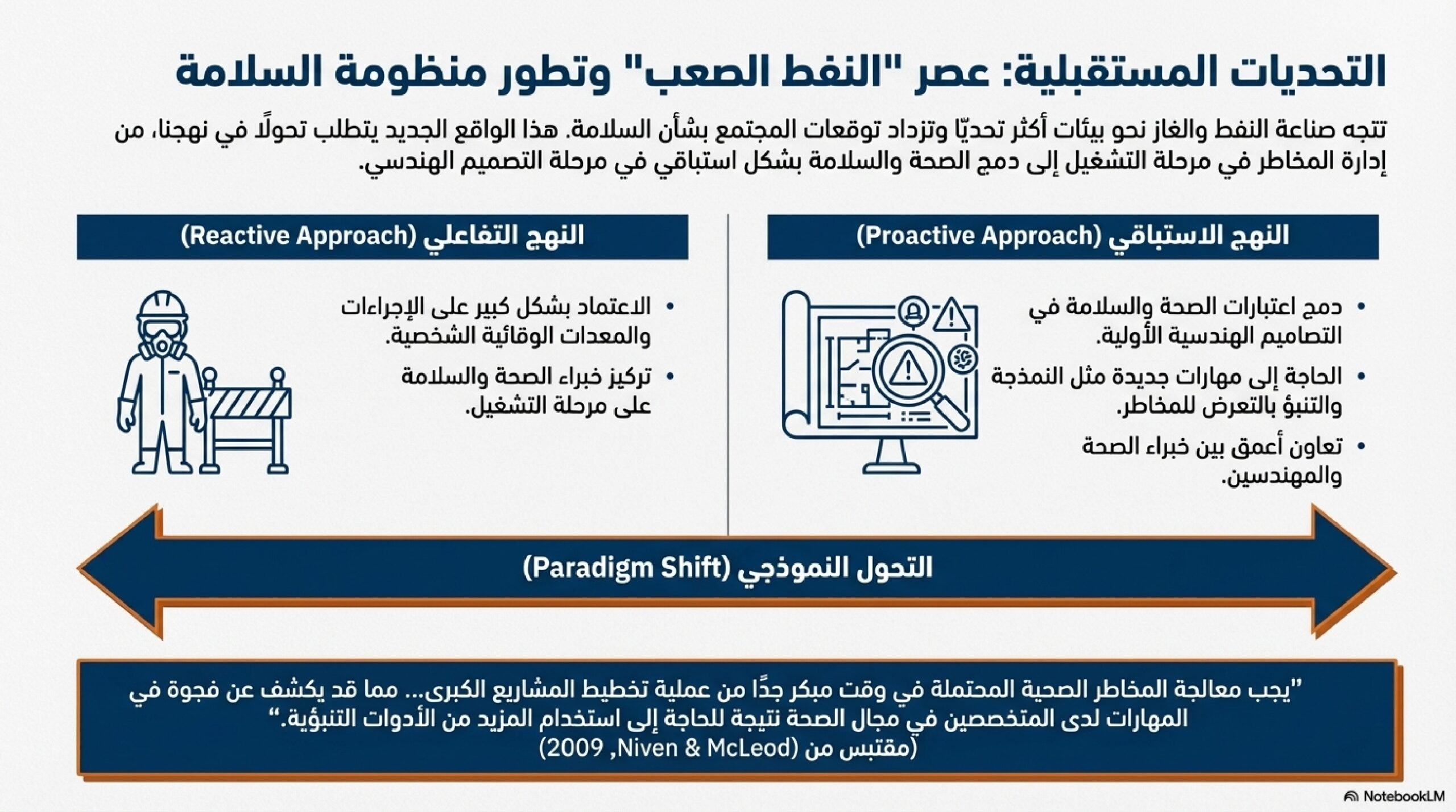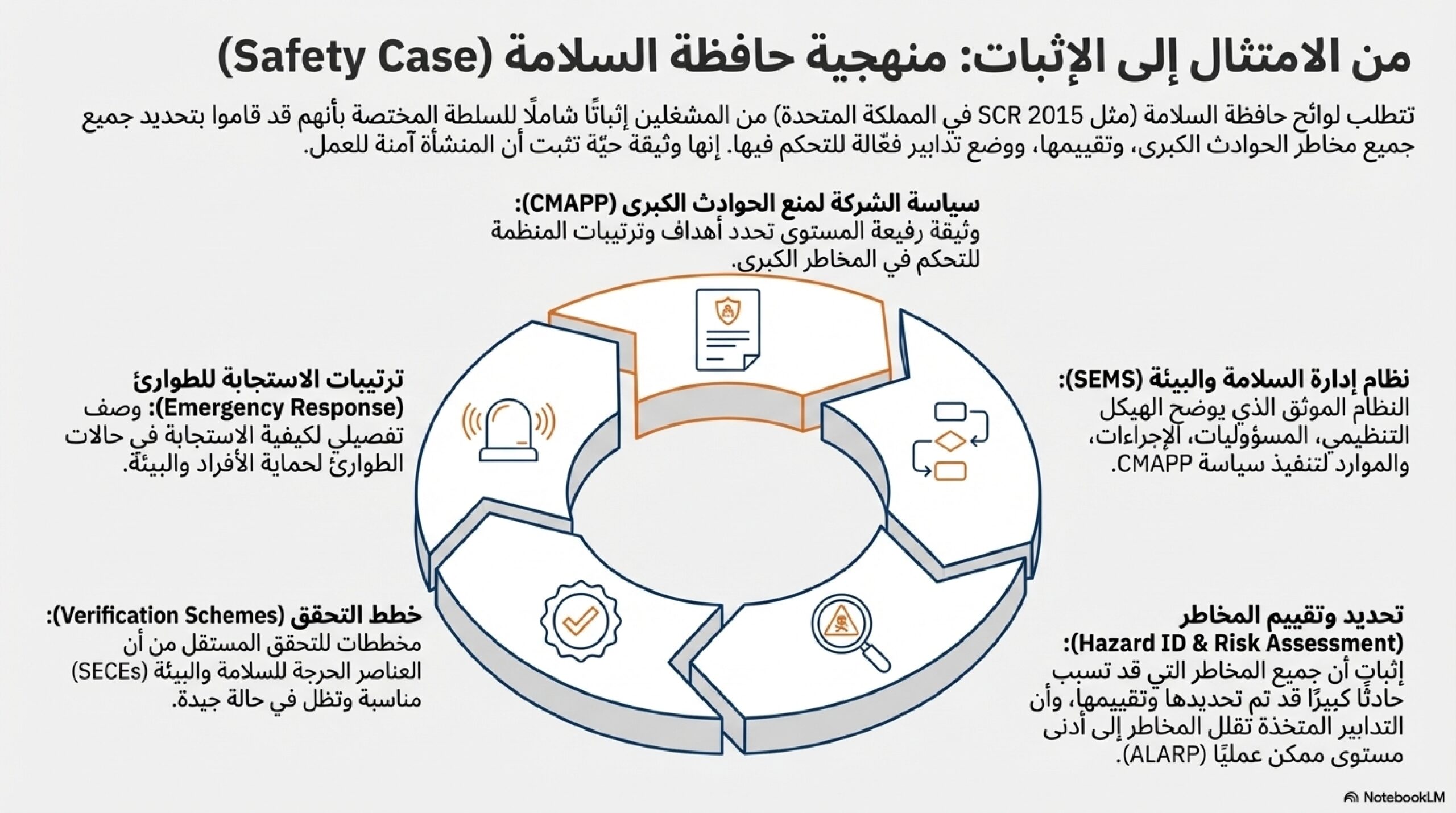 هناك تركيز قوي على إدارة المخاطر في قطاع النفط والغاز، حيث يُطلب من مشغلي المنشآت البحرية تقديم ومراجعة ملف سلامة (Safety Case) يوضح إجراءات التحكم في المخاطر وخطط الاستجابة للطوارئ.